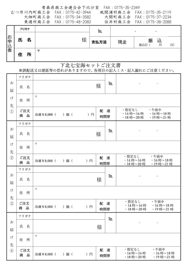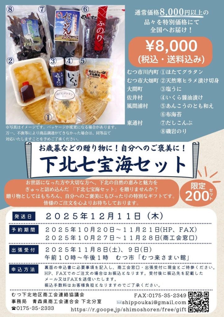 今年も「下北七宝海セット」が販売されます!限定200セットです。予約期間:2025年10月20日~11月21日(HP・FAX)2025年10月27日~11月28日(商工会窓口)お歳暮や自分のご褒美にいかがでしょうか??詳しくは、HPやチラシをご覧ください。